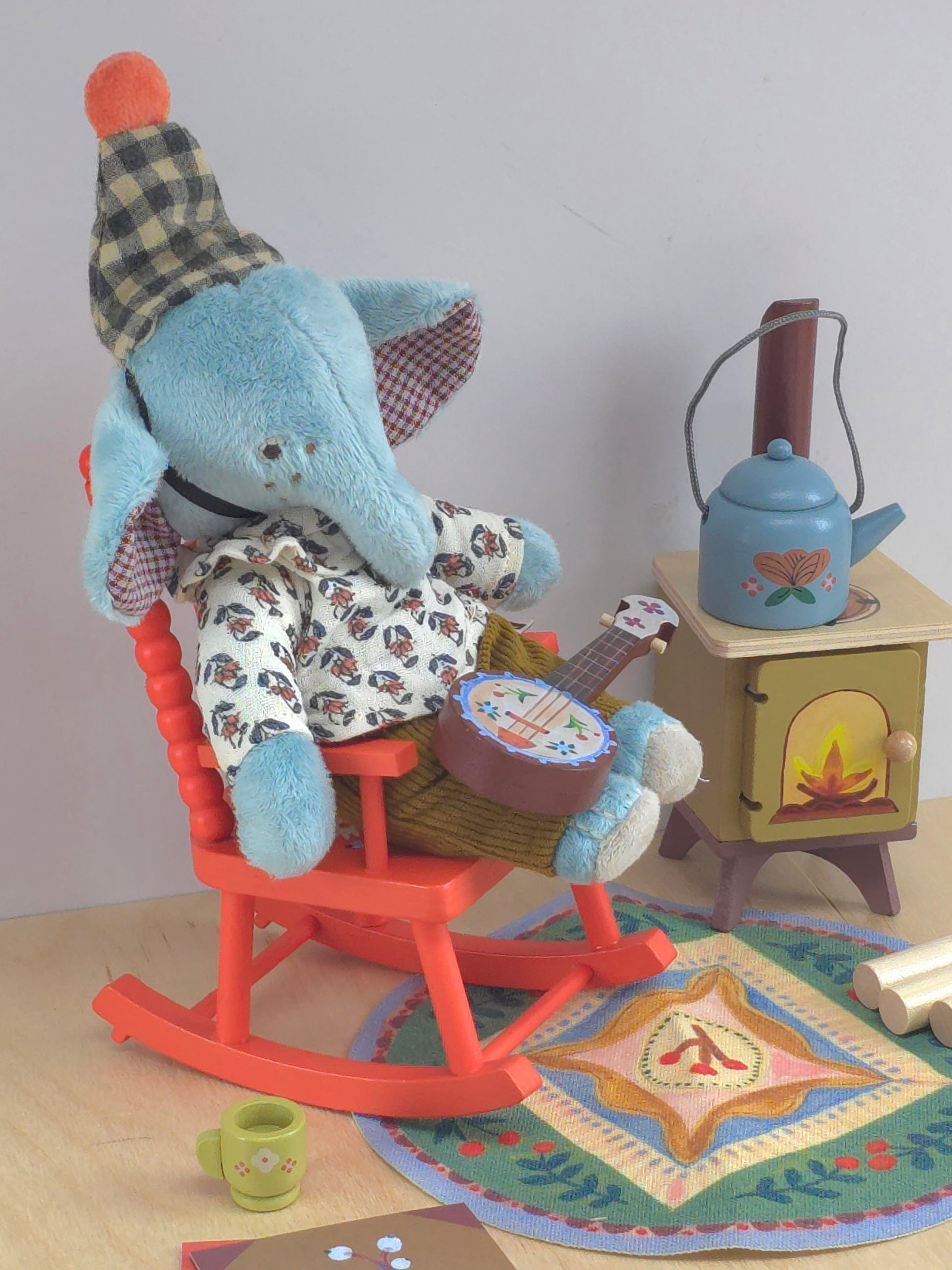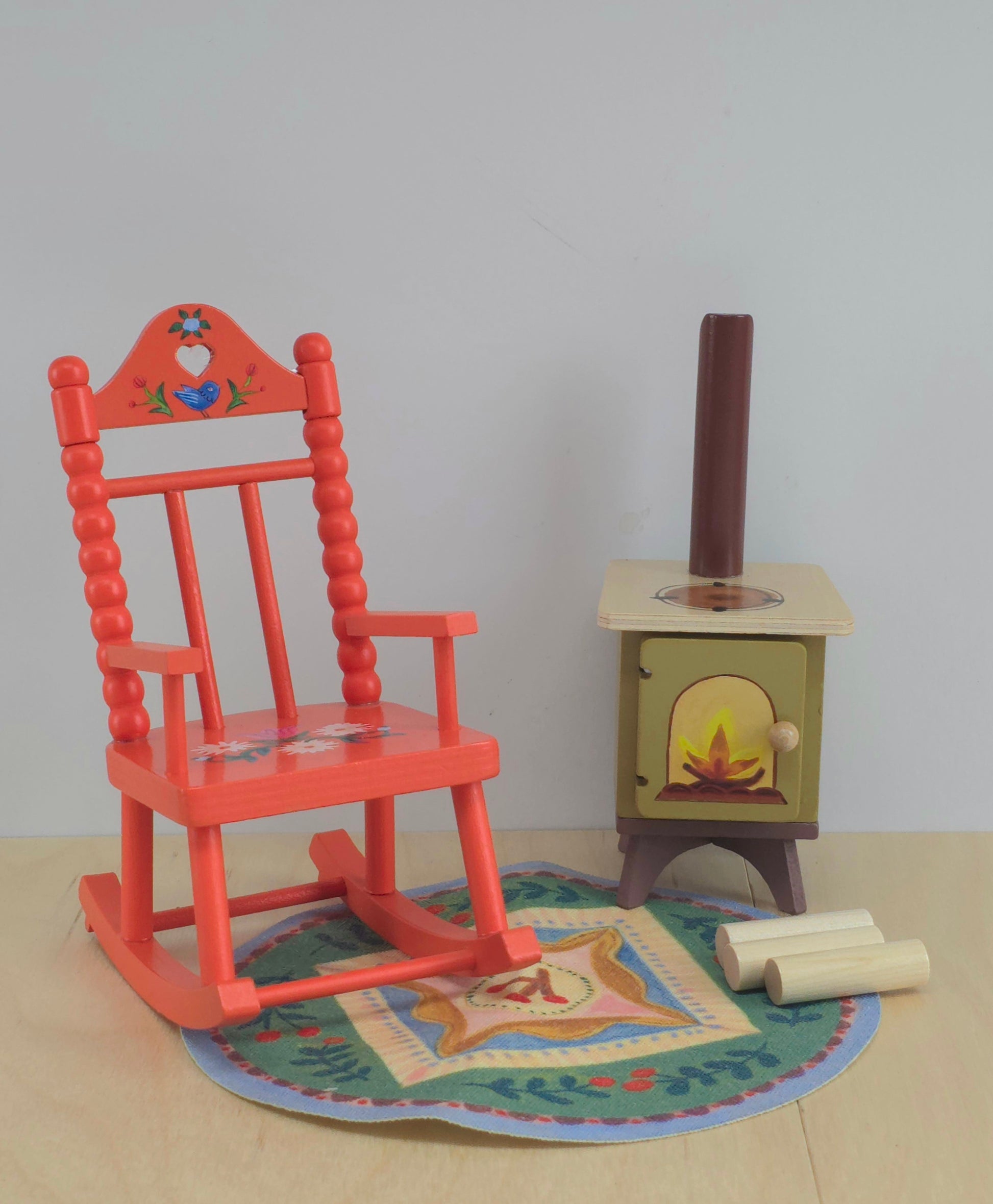 A little set of rolling chair, rug, wood burner and some logs for our vest animal friends.