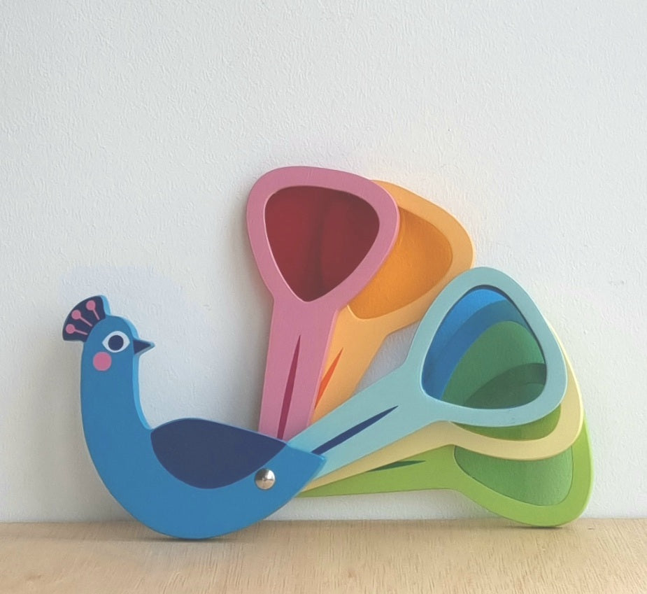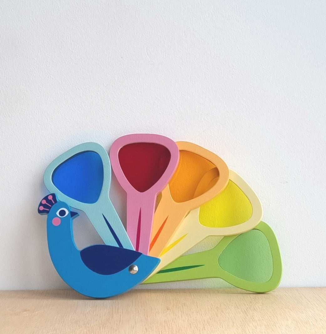 A wooden peacock that helps teach colours and colour mixing for the little ones.