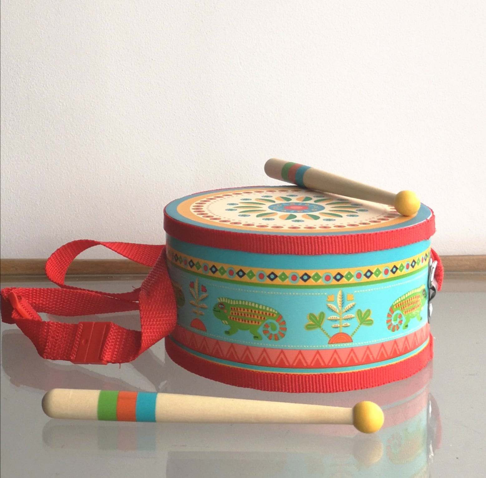 A lovely little illustrated drum with 2 drum sticks and a band to carry.