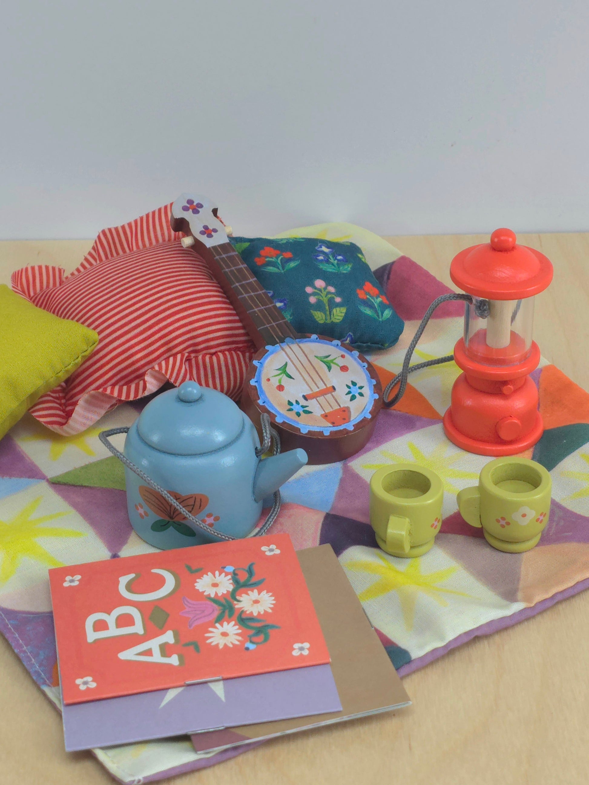 A lovely set for your best friend animal containing 3 pillows, a lantern, 3 books, a kettle and 2 cups, a picnic rug and a banjo for a sing along...