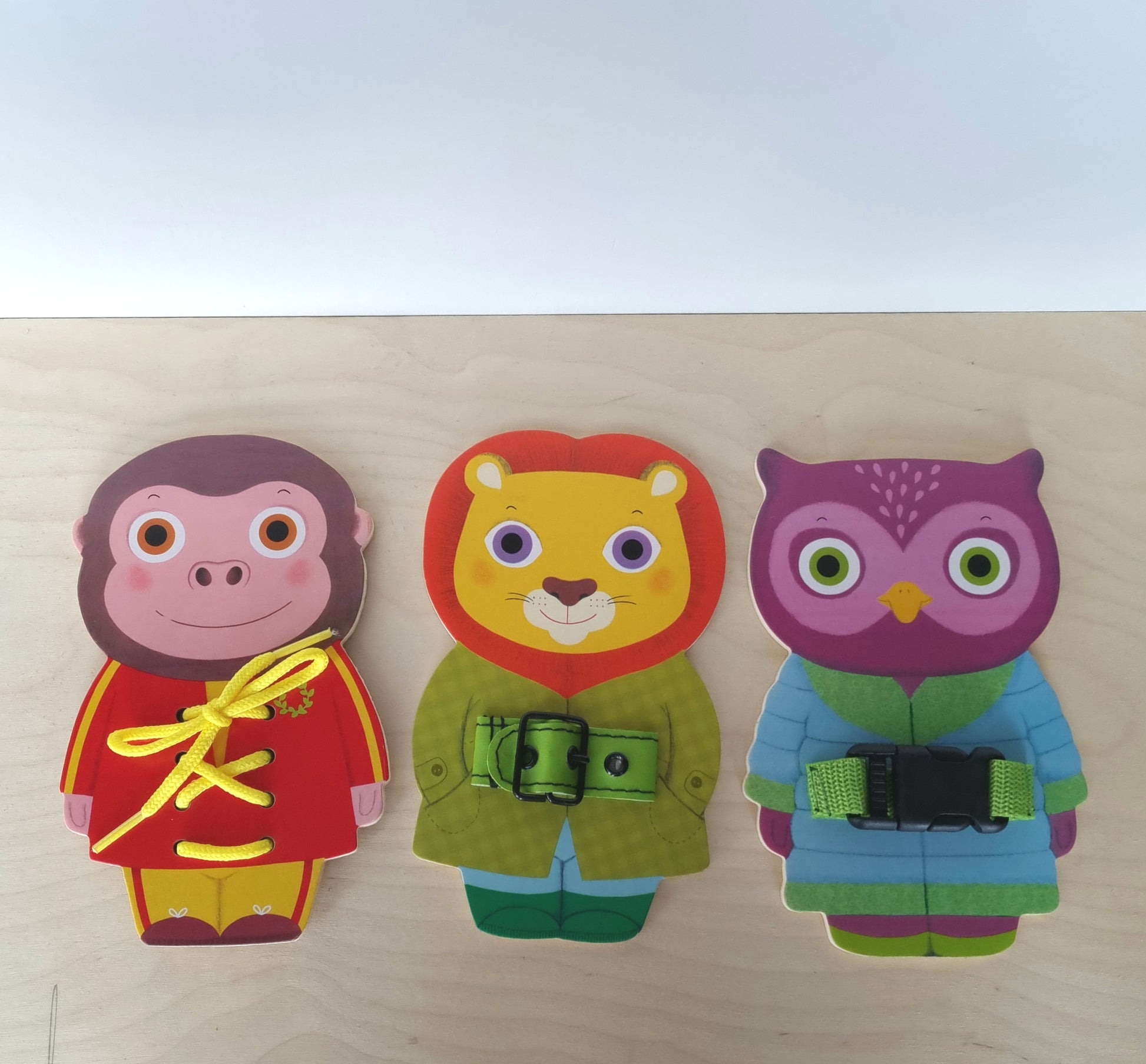 3 little wooden friends with different fasteners for learning through play.